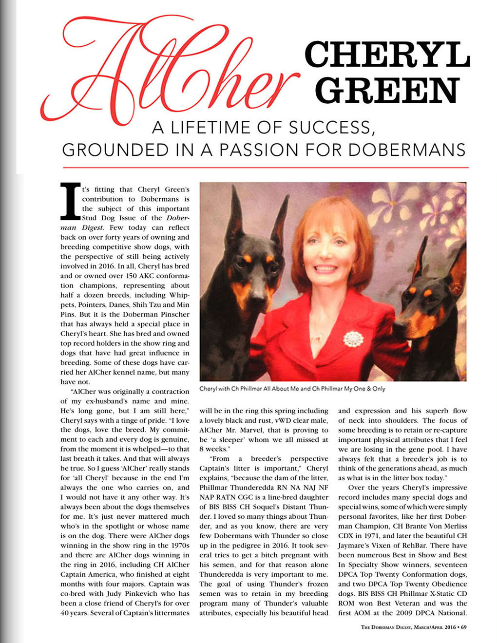 Fondly looking back on the joy all of my dogs have brought me, I am pleased to see bits and pieces of them living on in their progeny. I am excited about future generations and look forward to producing many more beautiful Dobermans under the AlCher kennel prefix. As always, my goal is to continue to breed the all-around Doberman who excels in conformation and performance, and at home is a beloved companion.