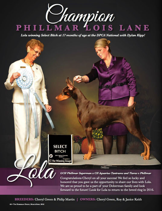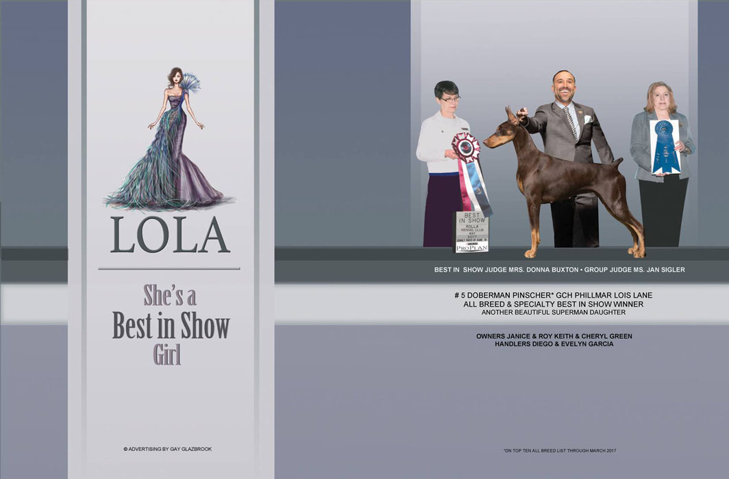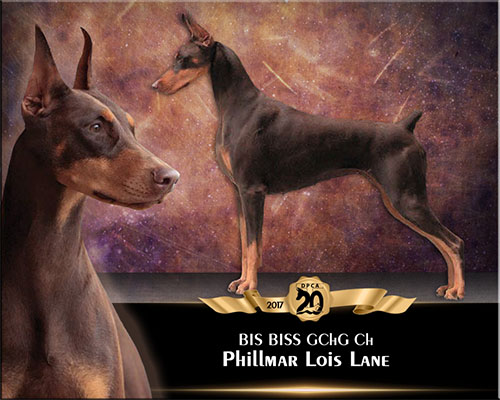BIS BISS GCH Phillmar Lois Lane "Lola" finished in 5 shows with Dylan Kipp and placed as She also received the 1st Award of Merit at the 2018 DPCA Nationals. |