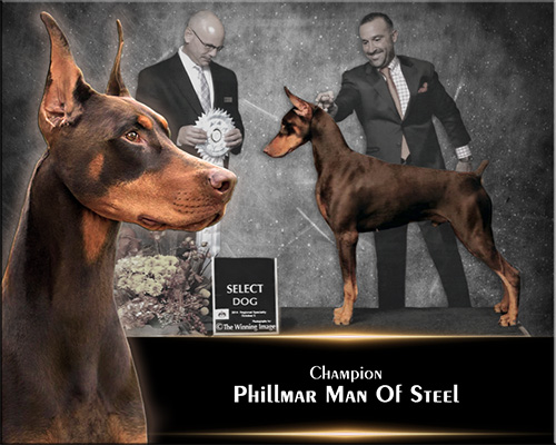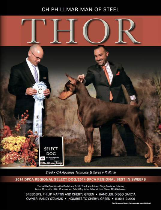 Thor finished his champion at 10 months with Diego Garcia. He was Select Dog at the Host Show in 2014 to his father Steel, who won Best of Breed. |