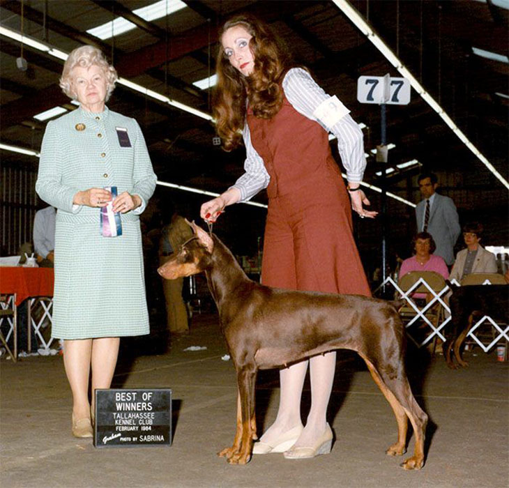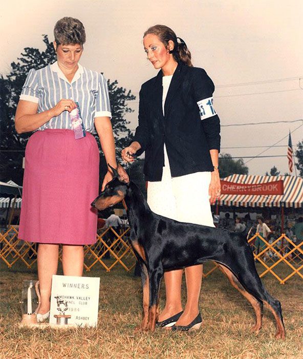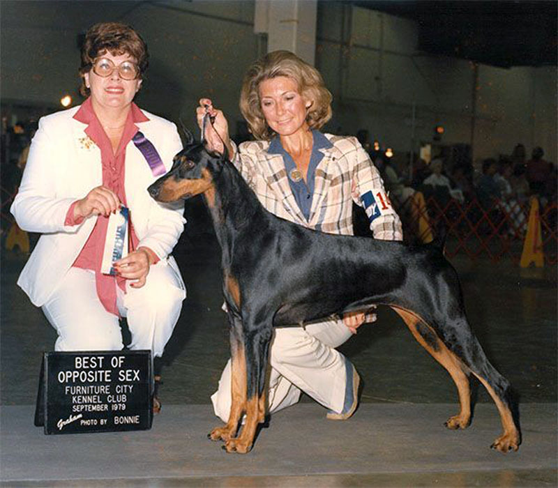 Ch Mikadobe's Cupid x Ch Lujac's Stinger Owned by: Dr. Aal Johnston and Cheryl Green Specialed by Betty Leinager. She achieved many Groups and Group Placements. Color: Black vWD: Carrier Hips: Normal OFA #:DP-1344 Here is a link to Tilley's pedigree on DobeQuest
