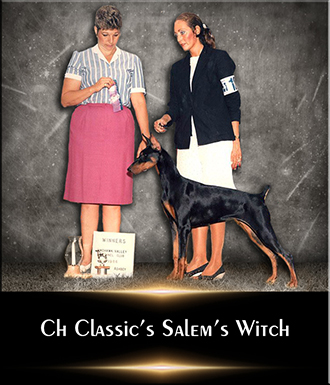 Ch Hotai Reo Speedwagon Classic x Ch Classic's Farrah Fawcett Owned by: Harvey & Betty Carter and Cheryl Green Color: Black vWD: Clear Hips: Good Here is a link to Salem's pedigree on DobeQuest