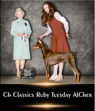 Classic's Damon D Schaftsohn x Ch Jaymares Vixen of Rehbar Owned by: Harvey & Bettye Carter and Cheryl Green Color: Red #7 bbDD vWD: Clear Hips: Good Here is a link to Ruby's pedigree on DobeQuest